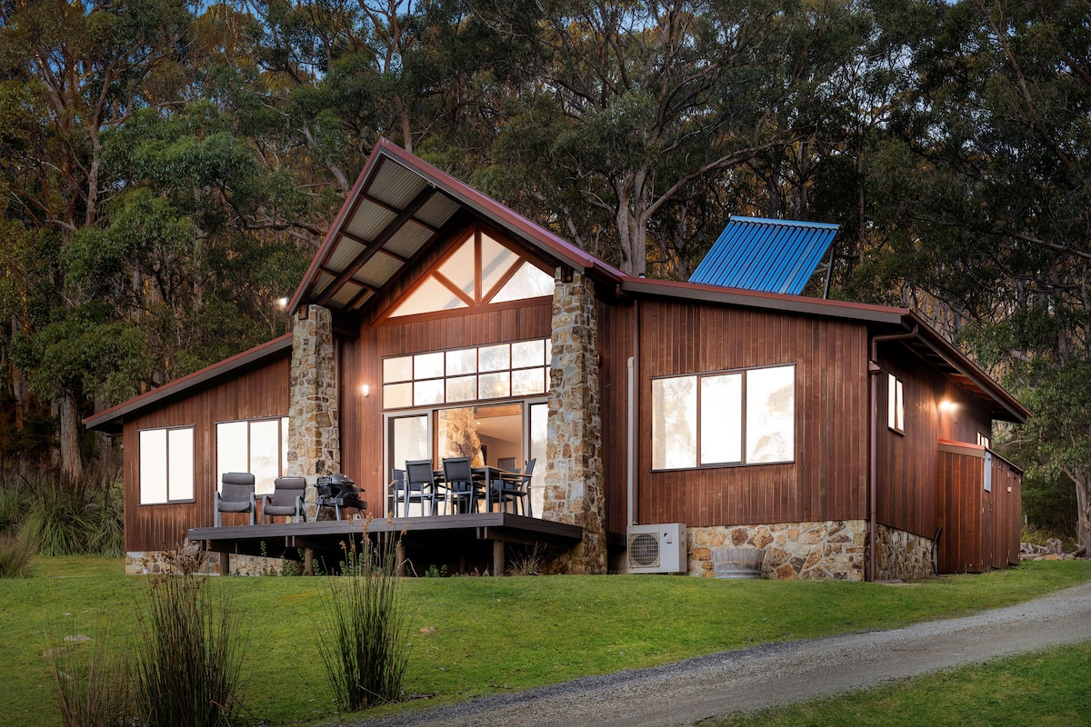 Getaway from the everyday and embrace relaxation. Nestled high on a hill overlooking glorious sunrises/sunsets, rolling green hills and orchards, blue skies and towering green gum trees. Friendly wildlife, twinkling stars and a custom made hot tub are yours when you stay here. Fall asleep on luxurious linen. Feel the quiet stillness of the surrounding Tasmanian bush. Pause from the race of life, rest, recharge, connect with nature and rejuvenate.