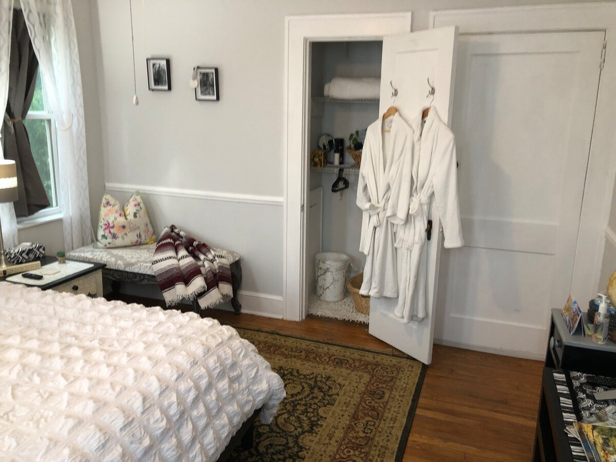 All of our rooms have private entrances and private baths. This is the 2nd of 3 rooms in our home. It is ideal for one person but we do rent it as a double. The bedroom measures approximately 11-1/2 feet by 11-1/2 feet with attached, small private bath w tub/shower. Bed is queen sized and there's a local TV. Kayaks are here for your use when available. Please contact us regarding kayaking. Coffee and microwave are just outside your door.