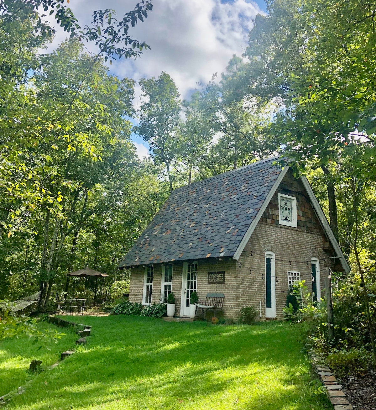 Our beautiful cottage for adults only is set on a private spring fed pond with all amenities to unwind from the day-to-day hustle. A porch with rocking chairs, brick fire pit and outdoor lighting in the courtyard make this your destination for relaxation. Take a walk in the 20 acres of wooded trails, fish, kayak, paddleboat, read a book, write, listen to music or just take a nap. This property lets you unplug from the world, relax, and connect with nature without giving up modern conveniences.