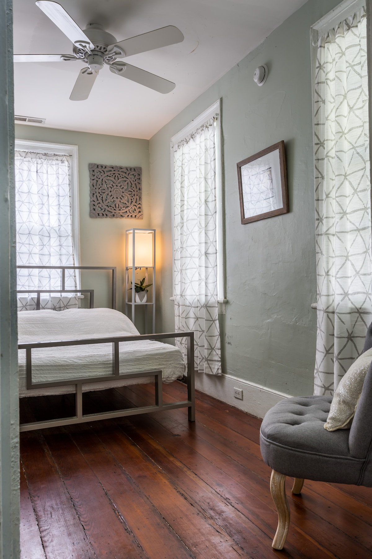 The Luca Room is a private room with a double bed and futon. There is a beautiful, large porch right down the hall and downstairs you will find three bathrooms and two kitchens. Light breakfast (coffee, tea, and oatmeal) and WIFI are included. Guests must be over the age of 18 years old in order to book with us and we do not allow pets. Self check in is anytime after 2PM. Located in the heart of downtown, cafes and shops are a few steps away. The Luca Room is ideal for travelers exploring CHS.