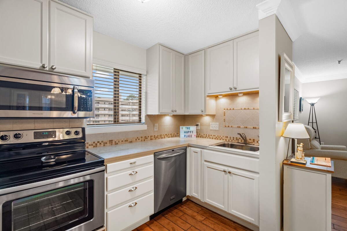 2 bed/2 bath condo includes full kitchen with S.S. appliances, dining area, hardwoods throughout & balcony overlooking the 6 lit tennis courts. The resort also features a deli & gift shop, 2 outdoor pools, 1 year-round inside heated pool (great for winter), running track, fitness, hot tub, sauna, elevators, golf nearby & laundry facilities. The beach is a 7+ min stroll down a board walk or during operational hours take the shuttle. At the beach you can stop into Coco's for lunch & cold drinks.