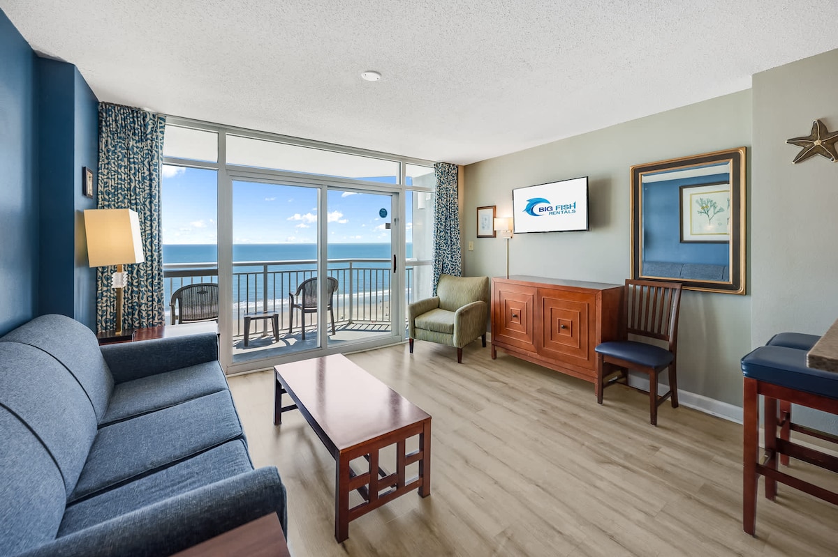 Beach Cove 910 at Big Fish Rentals Newly remodeled with all new furniture, this direct oceanfront 1-bedroom condo at Beach Cove Resort on the 9th floor features a private balcony, 2 queen beds, a sleeper sofa (sleeps up to 6), 2 HDTVs, a full-size fridge, microwave, 2-burner cooktop, high-speed free Wi-Fi, professional cleaning, a hairdryer, and free onsite parking. Note: Starting January 1, 2026, motorcycles are no longer allowed to park onsite.