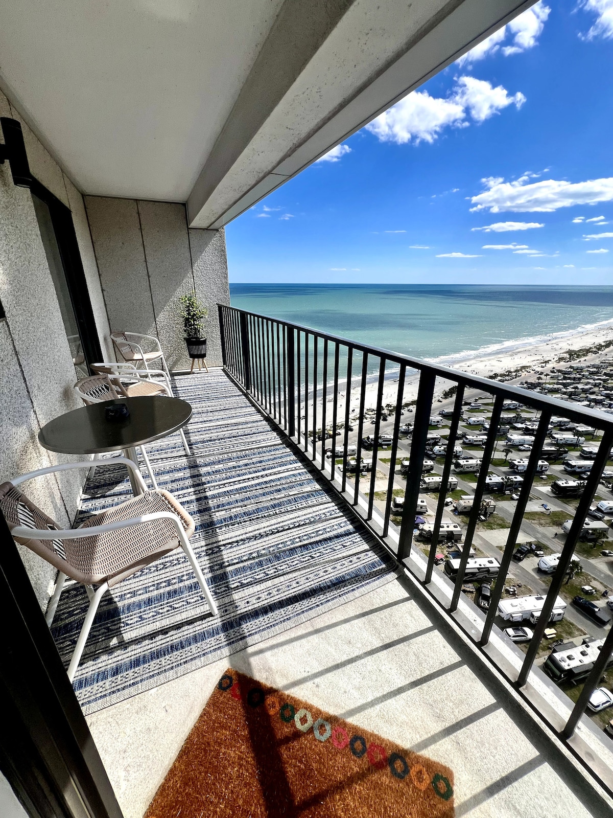 Our condo is located in the front section of the "A"Bldg.This condo has a KING bed in the master with a full sized private bathroom, twin beds in the 2nd bedroom and a queen sofa bed in the living room. There's also another full bathroom . We are located in a 33 acre ocean front resort with 6 pools on the border of Surfside at the southern end of Myrtle Beach,.We also have 24 hour security for our guests. Our resort is a very family oriented resort. Lazy river,heated pool.Outdoor games!