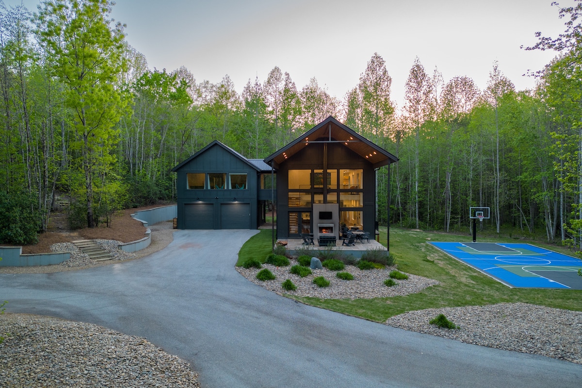 Welcome to Mountain Modern Base Camp where you can enjoy the solitude of nature while being a short drive to limitless activities. Private 7+ acre property provides an outdoor fireplace, full court pickleball & basketball court, creek to enjoy (w/a small waterfall), firepit w/ Mtn. View’s. 30' ceilings w/large windows in the main living areas & loft. Kitchen, living areas, loft, patios & woods are set up perfectly for everyone to have their own space or be together during your stay.
