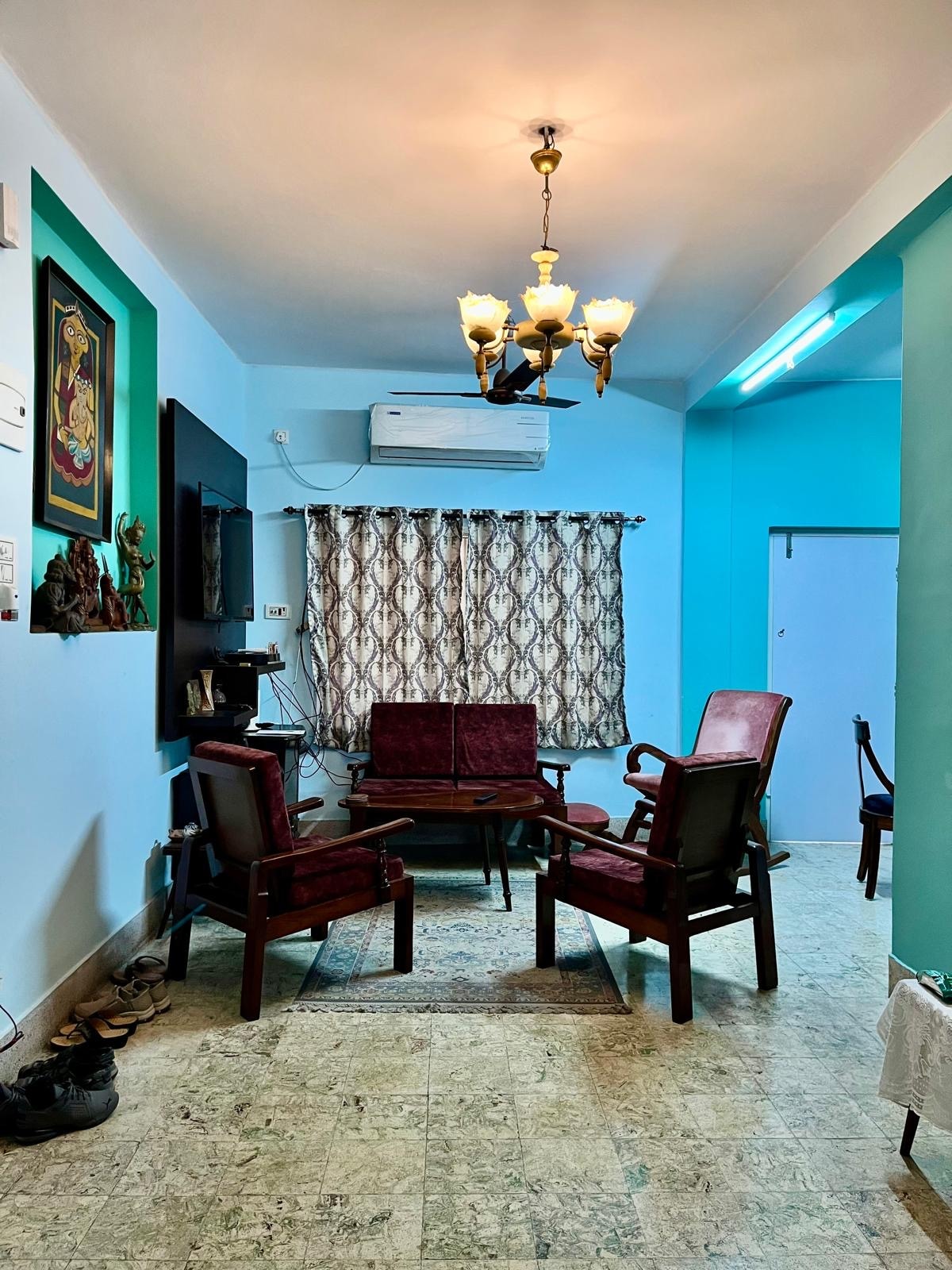 Welcome to our quiet, spacious and elegant home built in 1965. Located in an upscale neighbourhood with all the amenities that you need in a home away from home. This centrally located 1BHK home is airy, brightly lit and situated on the ground floor with an open balcony sit-out to take in the Kolkata vibe. The home has a living space decorated with vintage artifacts and furniture, an entertainment system, a cozy bedroom with a work space, a well equipped kitchen and 4-seater dining area.