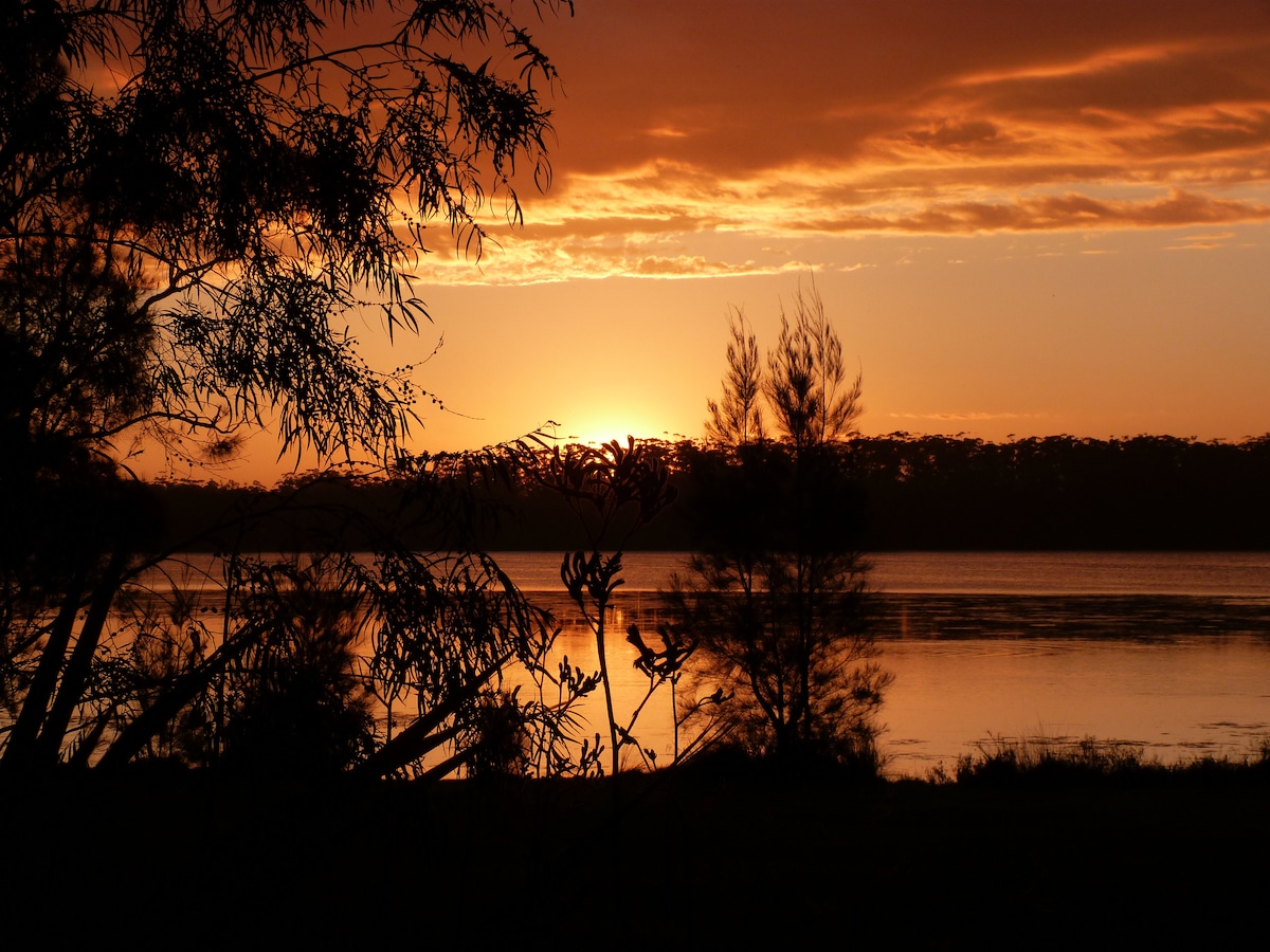 Nestled in a spotted gum & burrawang forest (6 acres with river frontage to the Bermagui River) & roughly 10 minutes out of town & beaches (3.5 km on an unsealed road), Moonrise on the River caters for people looking for a private bush retreat who enjoy waking to glorious sunrises, the dawn chorus of birdsong, sunsets, moonrises, the waves breaking from the surrounding beaches, bird watching, kayaking, bush walking & more.