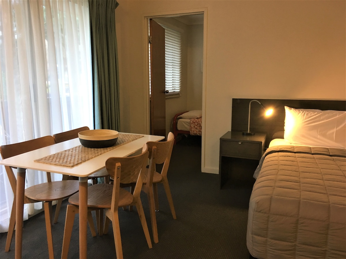 Our rooms come with all the convenience of a motel but the luxuries of a hotel. Our standard includes a full kitchen, private courtyard as well as a dedicated onsite parking space for your convenience. Local IGA, bakery, post office, cafe and pizza shop are all within short walking distance so you can settle right in. Extra bedding for 2 more guests available on request for a fee.