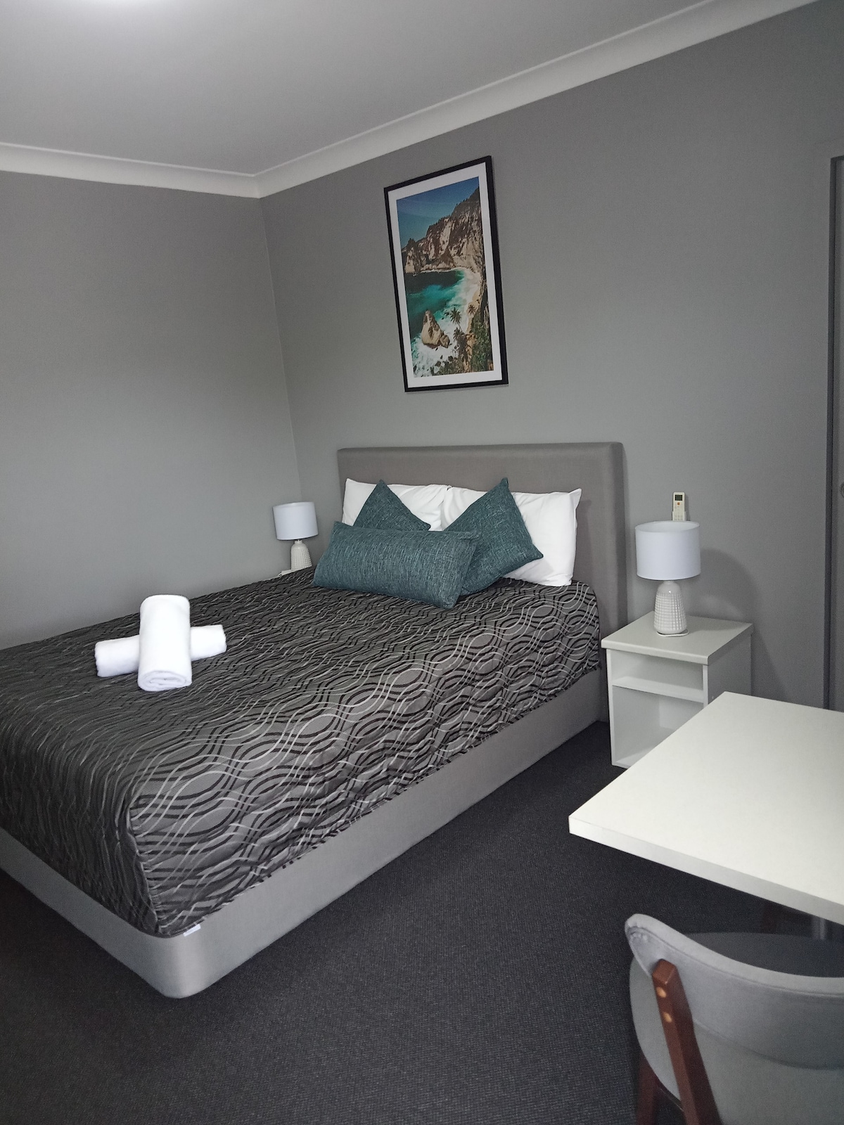 Queen Room (Upstairs & Downstairs) at Batemans Bay Lodge Our comfortable Queen Room is perfect for couples or solo travelers. The room features a queen bed, private bathroom, air conditioning, Smart TV, free Wi-Fi, mini fridge and tea & coffee facilities. Located in a quiet waterfront setting just minutes from Batemans Bay town center, with easy access to beaches, cafés, shops and scenic walking paths. Free on-site parking included.
