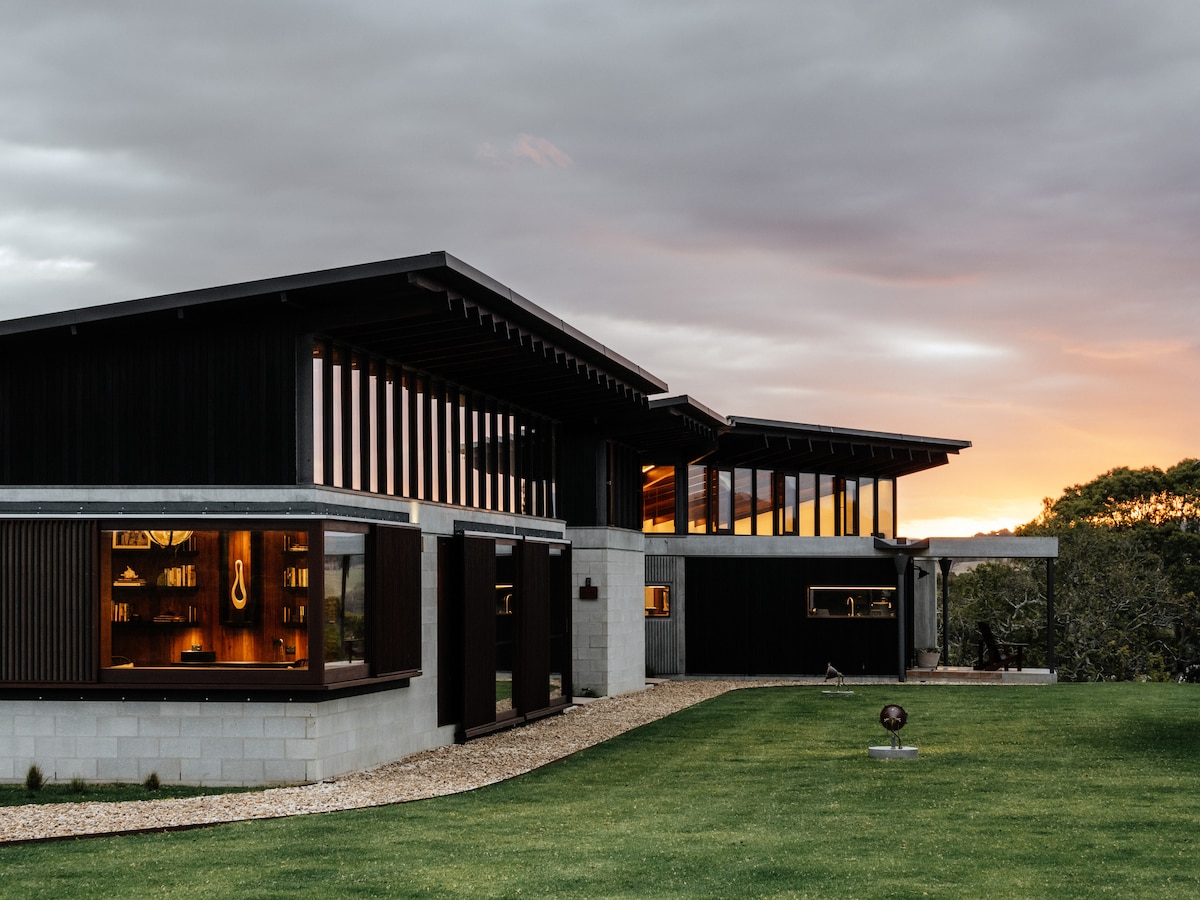 Feel the warmth from the crackling fire while you gaze out over the moonlit ocean at this modern farmhouse in Gerringong. Situated 5-minutes from town, and just over an hour from Sydney, this coastal villa enjoys complete seclusion. Wander the on-site trails, explore 200 acres of rainforest, and meet grazing livestock on your way. Follow the coastal walking track, and you’ll be in town in no time.