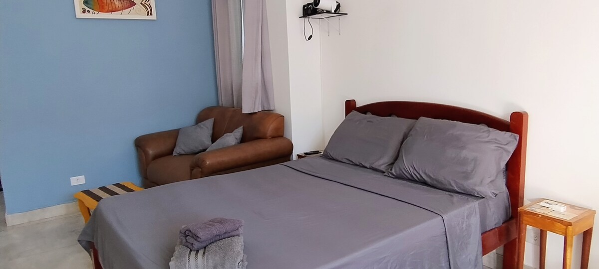 Casa térrea ideal para dois hóspedes, um espaço exclusivo, a 500 metros da praia, ótima localização: próxima a restaurantes, padarias Peg Pão e Pão de Maçã, Mercado Extra, Sodiê Doces, Academia Panobianco. Cozinha completa, suíte ampla com ventilador, varanda nos fundos com rede e churrasqueira de chão. Estacionamento para um carro pequeno ou médio porte.