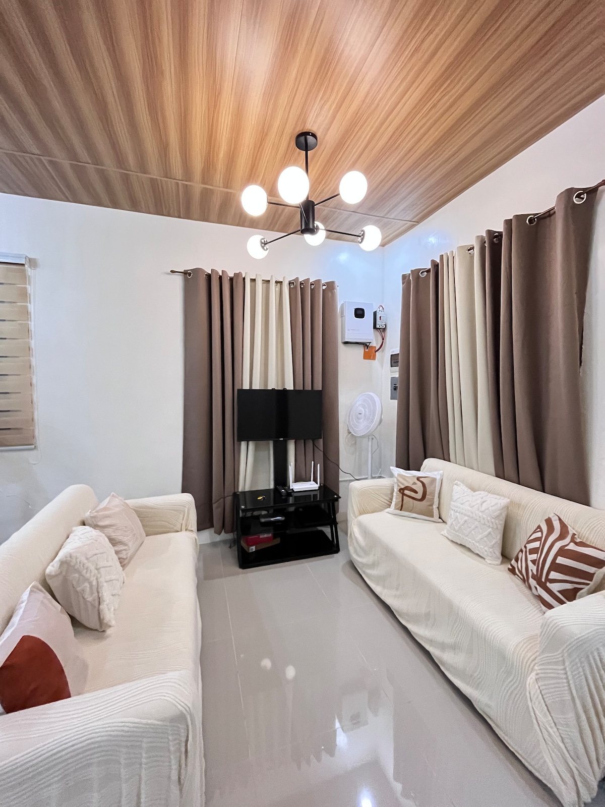Relax with the whole family at this peaceful 2BR home—cool and quiet even at night. Comfortably fits 4 guests, with a sofa bed for one more guest. All windows have blackout blinds so you can rest anytime. Grill or dine in the spacious patio, host mini gatherings in the extra yard space, or park up to 2 cars securely. Enjoy Netflix-ready TV, board games, and nearby sari-sari stores, laundry, water refilling, and home massage services. Need a ride? We can assist with transport