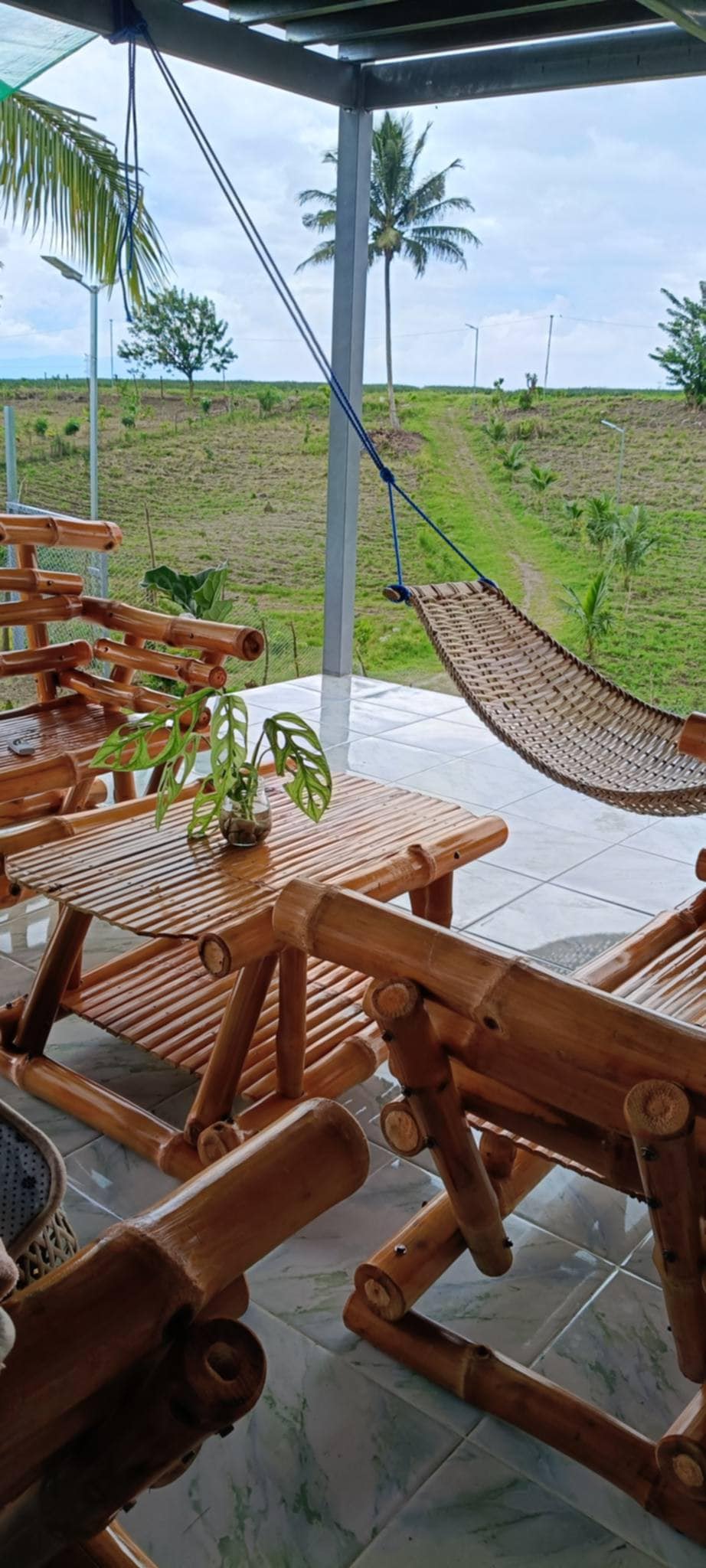 Modern guest suite, a/c, on 2nd floor overlooking the city, built for relaxing convenience, soothing open air winds blowing into the open dining and sitting room, equipped with a/c, hot shower, and a wonderful view of the open air surroundings of the community. Room has sliding doors to open both walls, for optional windy cool nights and fresh air. We have gensets to run 24-hr operations in case of brown-outs.