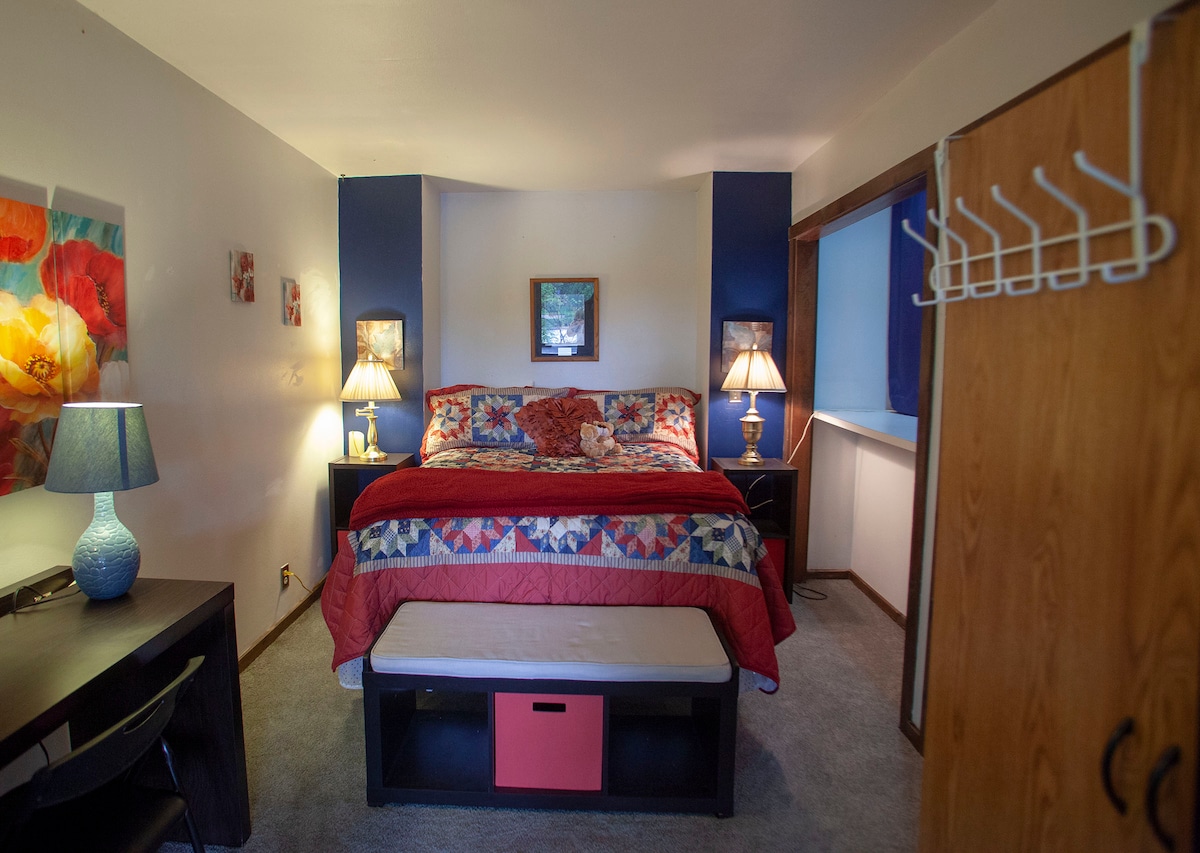 This is a beautiful lakeside home located on the west side of Rapid City. Huge windows creating a beautiful bright space with lake views. Relax in the hot tub and enjoy the surrounding nature! Spacious common areas, kitchen and private half bathroom. This room has a Queen Size bed for a max of 2 people.