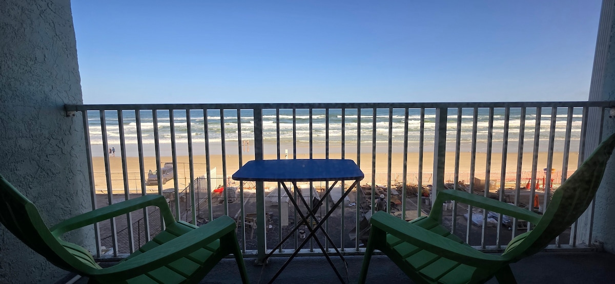 Platform fee 18.5% is paid by host Ocean front Studio Condo with Beautiful View!, on the 4th floor ocean side of the 5 story building. Wide Shared balcony & chairs overlook the ocean & sun rise. Ideal for guests who love a beach and ocean view. Some resort amenities damaged, some recently opened: **Open Amenities • 8:00 AM – 8:00 PM • One Outdoor Pool • Indoor Pool • South Spa • Fitness Center / Gym • Sauna **Primary guest registration with ID required through guest portal.