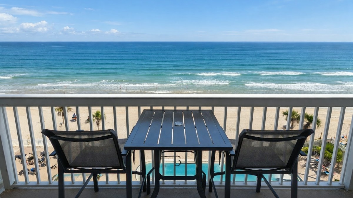 STUNNING BEACHFRONT VIEWS! Luxury renovated condo + panoramic ocean vistas. Master king suite private oceanfront balcony + 2nd bedroom & bath = 2 queen beds. NEW fully stocked kitchen! Direct access to pristine no-drive beach w/ soft/firm sand, heated oceanside pool. Premium family-friendly retreat - smoke & pet-free. Wake to magnificent Atlantic sunrises! Tranquil Daytona Beach Shores escape - book for your relaxing fun beach vacation! Tastefully decorated for Christmas!