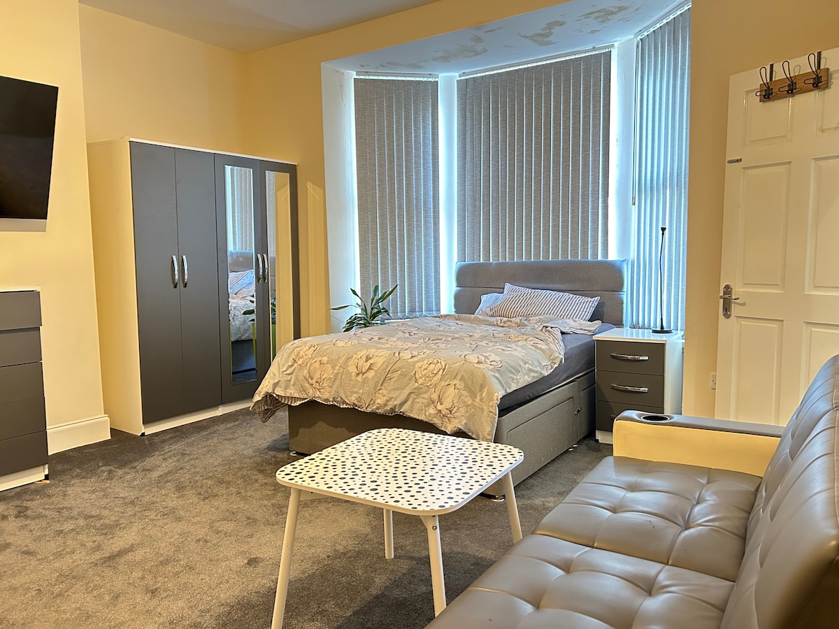 A first floor one bedroom flat . Own entrance , off road parking. (URL HIDDEN) Lounge with tv , freeview, dvd , wifi . Folding table with 2 chairs , sofa bed, chair . Kitchenette with microwave, kettle,toaster ,fridge. , equiped with all utensils crockery etc. Milk, tea, and coffee, provided for the first night.Bedroom has a double bed, wardrobe, chest of drawers. Shower room with shaving point, hair dryer. This is a nice compact recently refurbished flat. Access by stairs .