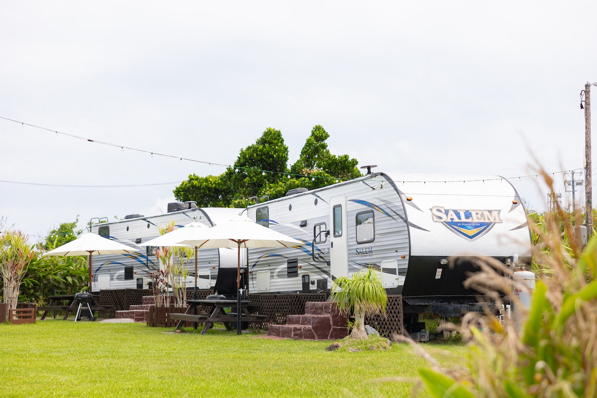 目の前に広がるオーシャンビュー、絶景の夕陽、満天の星空 綺麗に整備された芝生にトレーラーハウス3棟! 1棟4名様でご宿泊。トレーラー3棟利用の場合、最大12名様まで宿泊可能♪ ※ご予約人数によってご利用出来る棟数が変更になります※ ペットもご宿泊可能!※ゲージを持参ください※ ご家族や気の合う仲間とビール片手に楽しむBBQ! 自家農園から収穫した野菜をその場で調理して食べることもできます。 BBQセット無料 ※食材はお持ち込みください。 残波ビーチまで車で約3分 那覇空港から車で約1時間15分 読谷バスターミナルから徒歩約7分 コンビニまで車で約3分 青の洞窟まで車で約11分 残波岬まで車で約4分 ★5歳以下のお子様無料(添い寝)※ご予約時は乳幼児(2歳以下)でご登録下さい。寝具やタオルアメニティは対象外となります。 ★駐車場無料