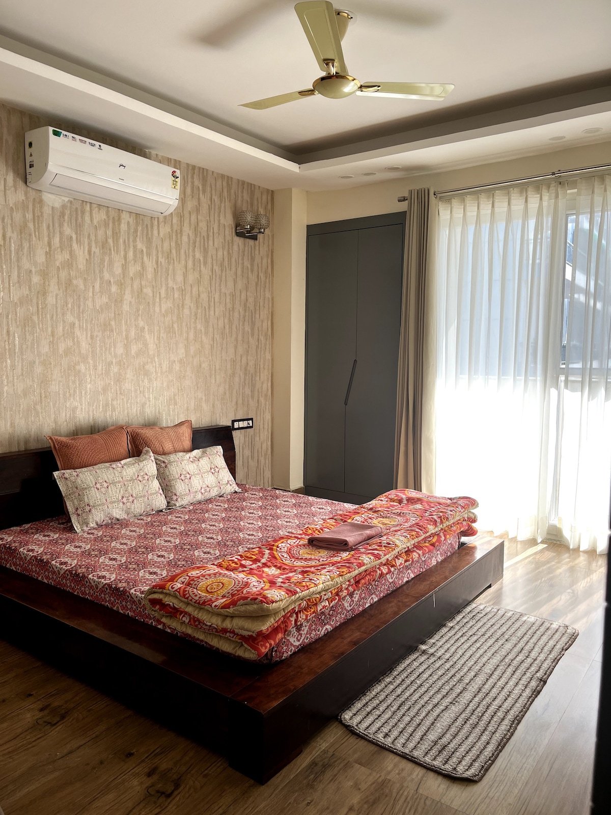 Best located aerial green view private room with attached bathroom & additional private glassroom which opens to terrace ..2 metro lines 500mts away. Room has designer wooden interiors . Floor bedding for guest @ extra Rs500. Room has indoor ambient mood lighting and TV/ wifi facility n open air garden terrace n studyroom. Room Cleaning & washing of clothes extra @ Rs 100 per day .Ac charges 300 per day to be paid at time of Check-in on usage.
