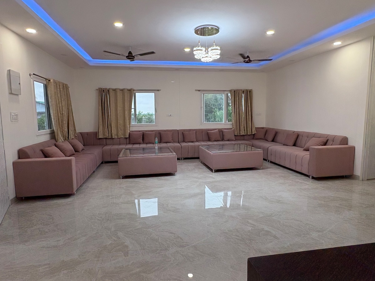 Experience serenity near Delhi/Gurgaon in a stunning home located in Greenfields Colony. This spacious retreat offers breathtaking lake views from the front and lush park views from the back balconies. Enjoy 3 large bedrooms, each with private bathrooms and geysers, plus lift access, indoor and outdoor parking. Relax in 2 elegant drawing rooms featuring a bar and a large dining table. Perfect for families or groups seeking comfort, convenience, and peace just minutes from DL/GGN!”