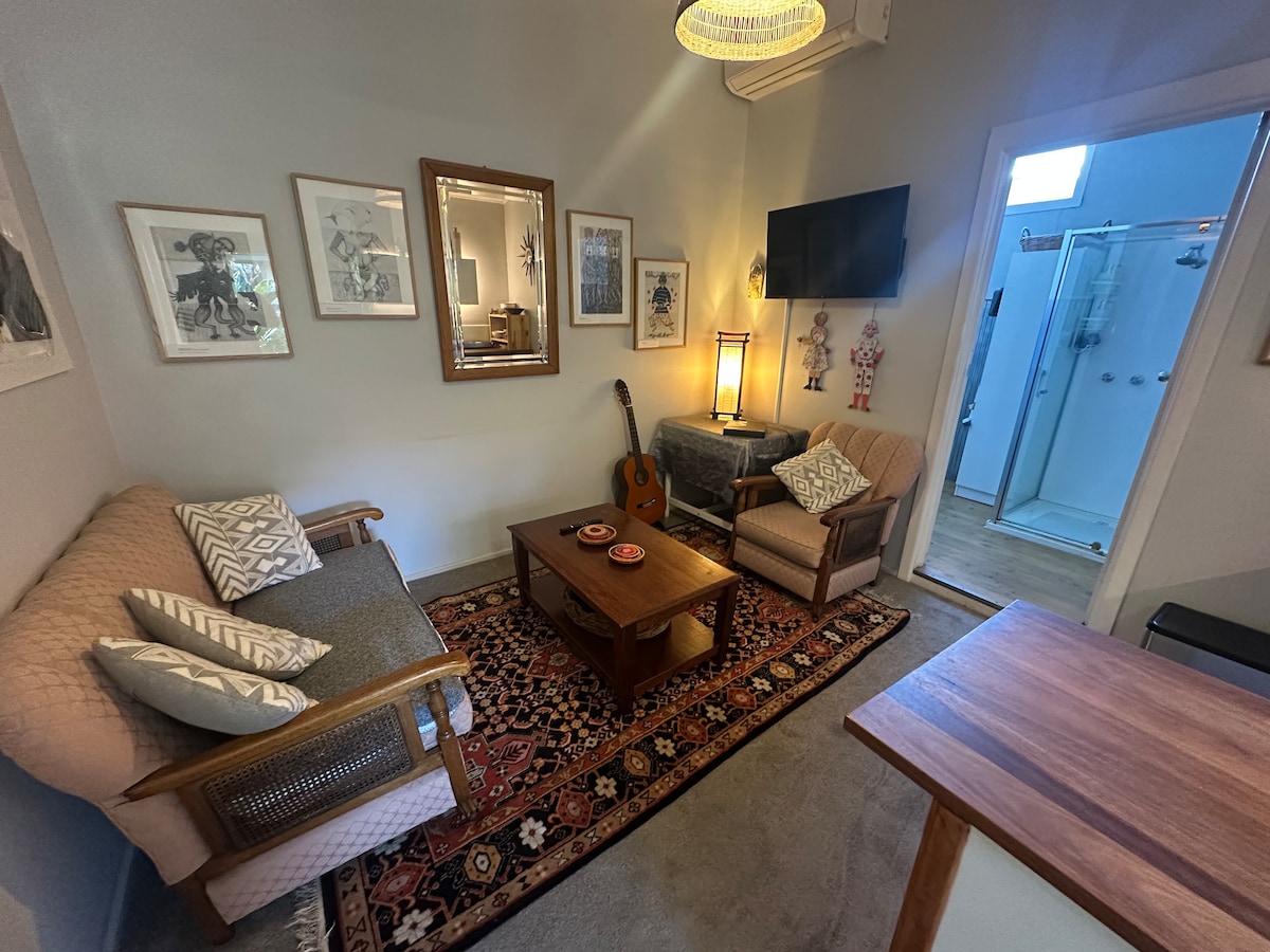 Peaceful loft‑style retreat in the heart of Albert Park. Large open‑plan space with polished floors, vintage charm and modern comforts. Relax in the king‑sized brass bed or unwind on leather sofas. Enjoy Wi‑Fi, TV including Netflix, air‑con, and a compact kitchenette. Private guests-only entrance. Unrestricted on-street parking using host's permit Parks, beach, and local dining all within a short stroll and a tram stop to Melbourne’s CBD only 70m away.