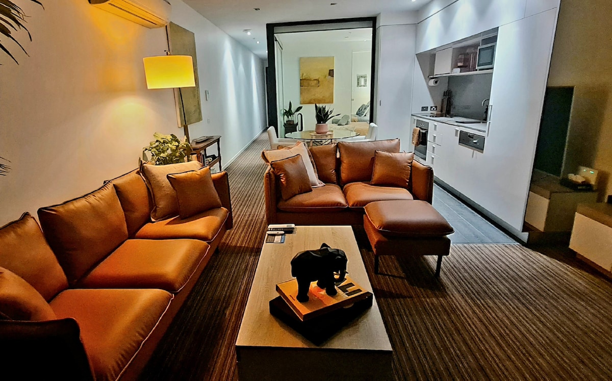 Welcome to my apartment with breathtaking city views. Nestled in the heart of Fitzroy Street, St Kilda, this urban oasis offers a comfortable stay for solo adventurers or couples. As you step inside you'll find everything you need from a well equiped kitchen and a living room with both a 2 seater and 3 seater couch and a 75inch TV. The master bedroom has a glass window wall allowing a dazzling city view from your bed. With its soft lighting and minimalist design, you will be well rested.