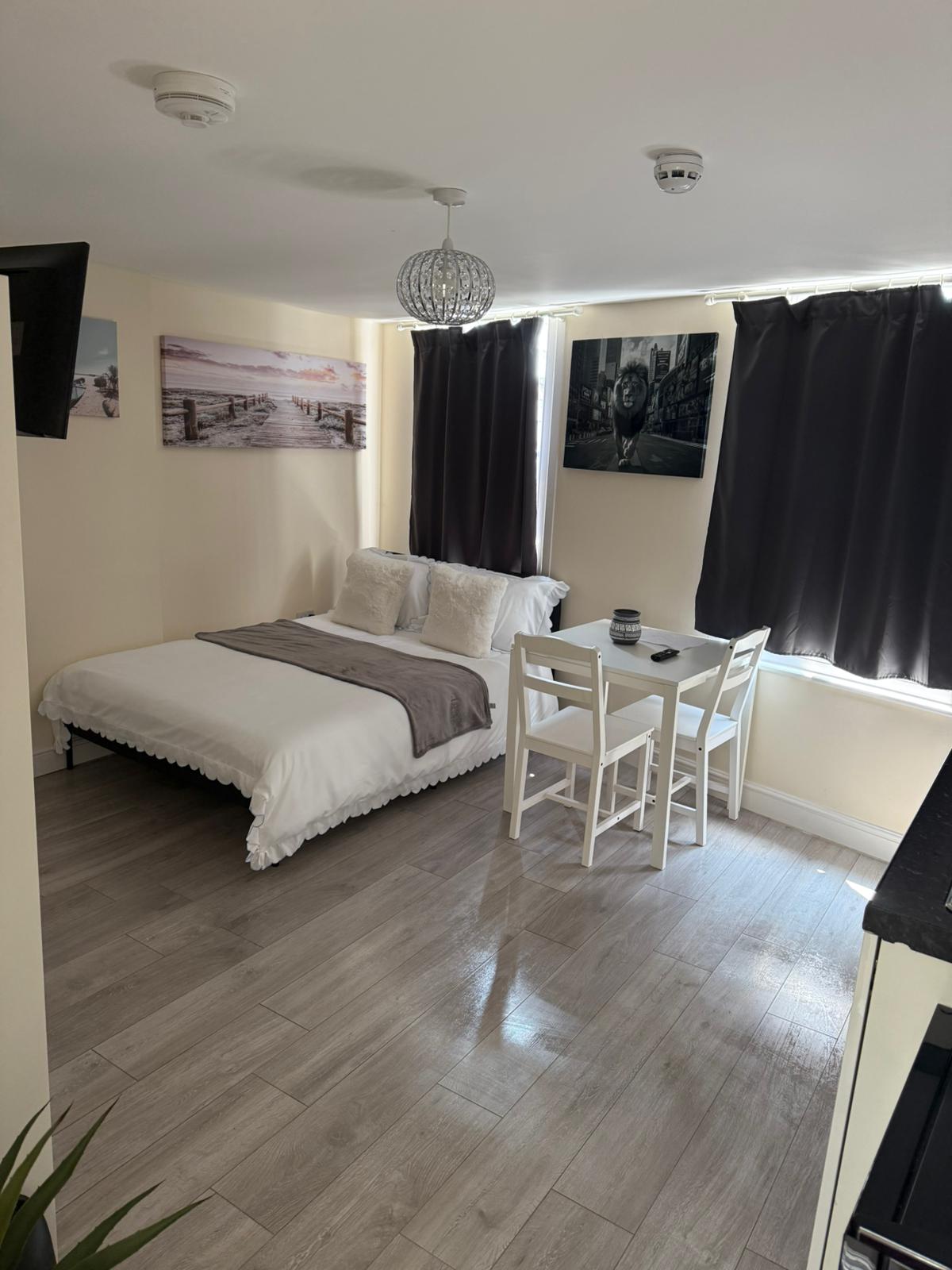 We recently transformed our large, 70 sq. meter, double garage into a stylish, open plan studio apartment with bleached oak, hardwood floor. It is a fantastic, light, and relaxing space with 3-meter bifold doors with integrated blinds that fully open out onto a shared courtyard with our house. There are large electric Velux sky lights with blackout blinds. It is a fantastic light space to relax or work. It has its own private access from the street.