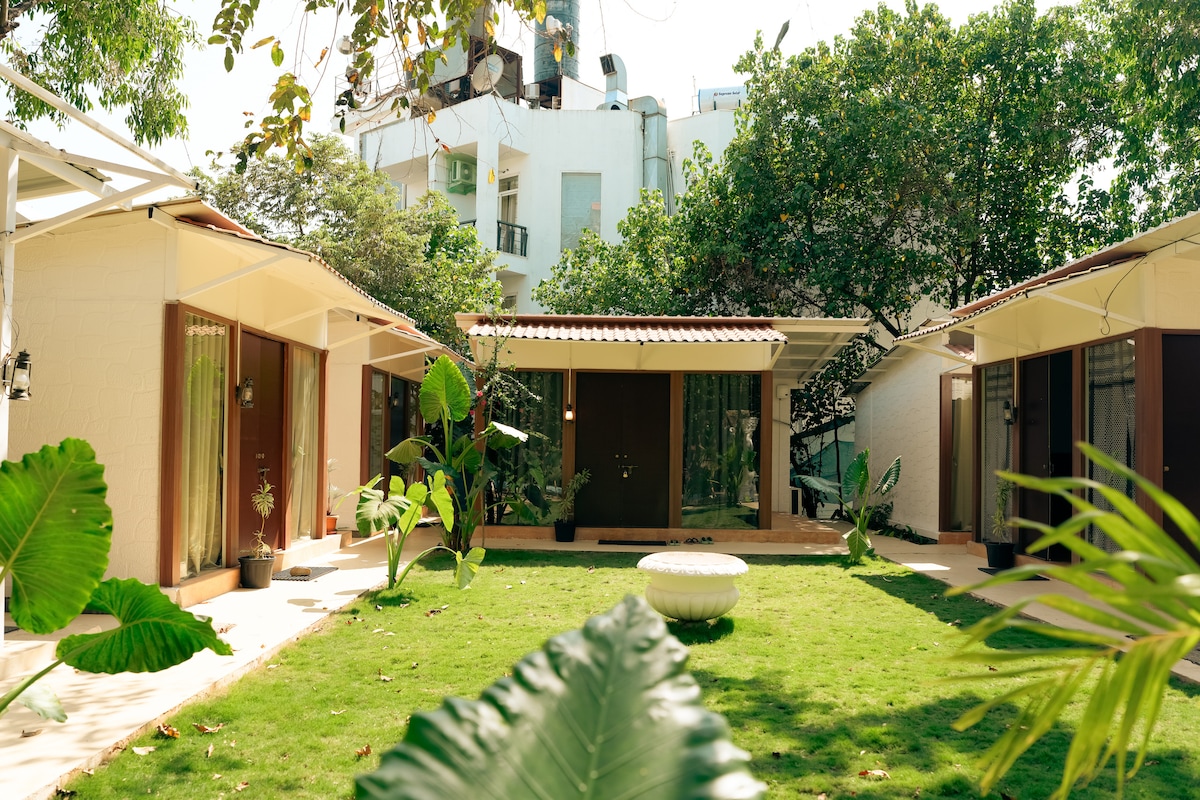 Another HNH masterpiece- This chalet is located inside a resort Saipem which is a hilltop neighborhood in North Goa on the outskirts of Candolim. It offers a blend of serene, elevated living with proximity to the coast, situated near river streams and lush green surroundings. Saipem is a distinct part of this area that provides a quieter, more secluded experience compared to the more bustling parts of the beach yet a mere 7 minutes drive to candolim beach.