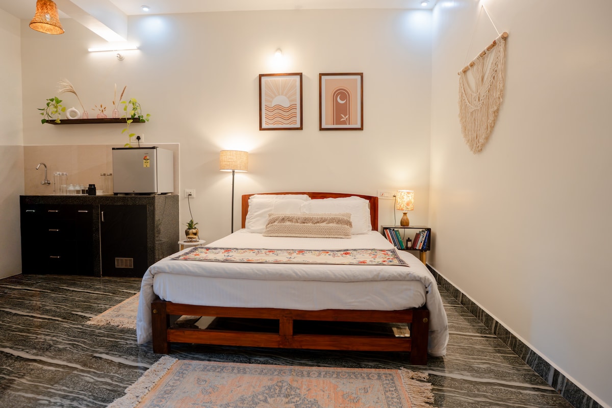 Cute & Cozy Riverside Studio in Siolim, Goa This charming yet spacious studio is centrally located in Siolim, right next to the river, and just a 13-minute drive to the sandy shores of Morjim Beach. Grocery stores and restaurants are only a 5-minute walk away for your daily needs. Popular spots like Thalassa, Kiki by the sea and other well-known party venues are only a 10-minute drive, making it perfect for guests who want to enjoy both calm mornings and lively evenings.