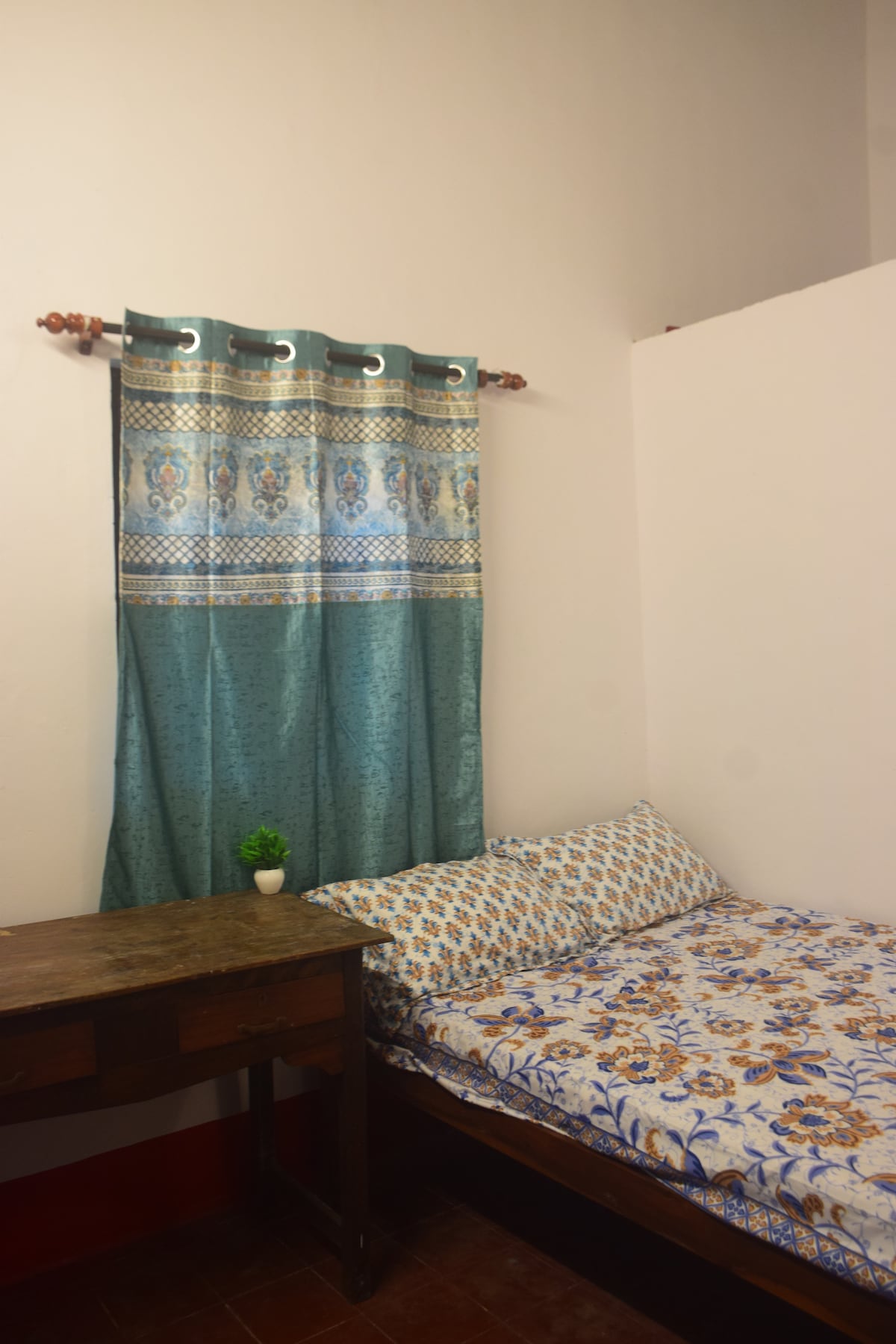 Sanitizing is important to us. We will not mingle with guests.Private gated green property with flowering and fruit bearing plants/ tree's as well as two lawn's and a sit out. Close to the main road yet far away from the bustling noise, restaurants and shops all within walking distance.A 5 minutes walk to the beach. Come relax.!The room is sanitized after every guest checks out,as per Airbnb norms. You are responsible for room house keeping,keep the room clean.Details of listing please read.