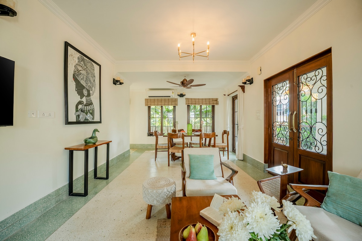 "Namaste! Welcome to your home away from home. This brand new modern home is away from city hustle-bustle and offers stunning views of orchards around. The beach is a short 2.2 walk. This part of the beach in Calangute is paradise, quiet & peaceful with nice shacks, allowing you to enjoy the sun at peace with the sea. Coracao specialties include Airconditioned living & bedrooms, Daily housekeeping, 100mbps wifi, modular kitchen, fridge, washing machine, pool & gym, kitchenware, and smart tv.