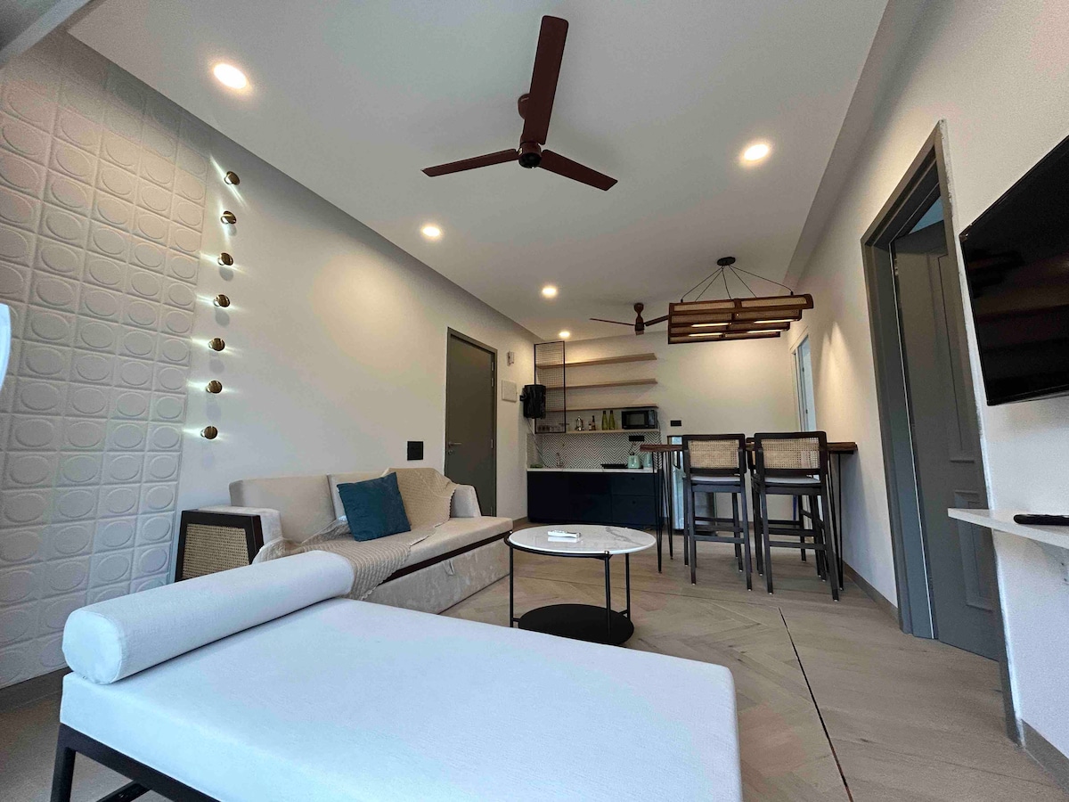 Modern Boho Apartment | Minutes from North Goa's Beaches.A cosy, fully furnished 1BHK retreat perfect for couples, friends, or small families. Highlights: - Stylish boho interiors with a warm vibe - AC in bedroom & living room for comfort - Smart TV + High-speed WiFi - Equipped kitchen with RO water, cooktop, fridge & washing machine - Shared swimming pool (9 AM–6 PM | swimwear mandatory - On-site gym available as a paid facility - 24/7 security for peace of mind - Free Parking