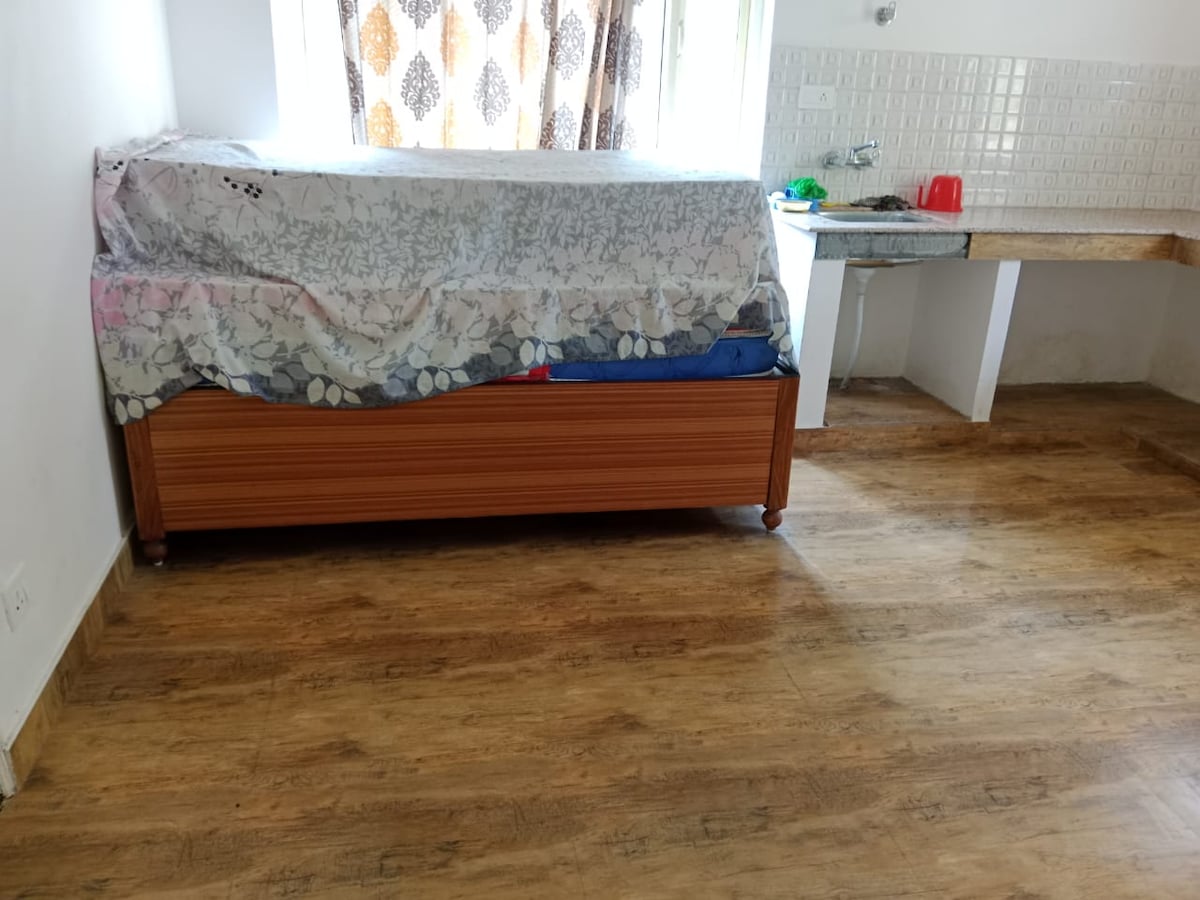 This beautiful home is located on Airforce road 3 Mod Bhowali Nainital. it is surrounded by pine tree forest. on one side is Nainital which is 12 km and on the other side is Bhimtal, Sattal about 12 km. The mall is just an aprx. 1.5 Km 1 bedroom floor in a villa building with 1 bedroom and 1 big dining hall that is comfortable for 2 adults and 2 children under 15 years, Modular kitchen is fitted with automatic cooktop, dishwasher, big fridge, chimney cooking utensils, geysers in the bathroom.