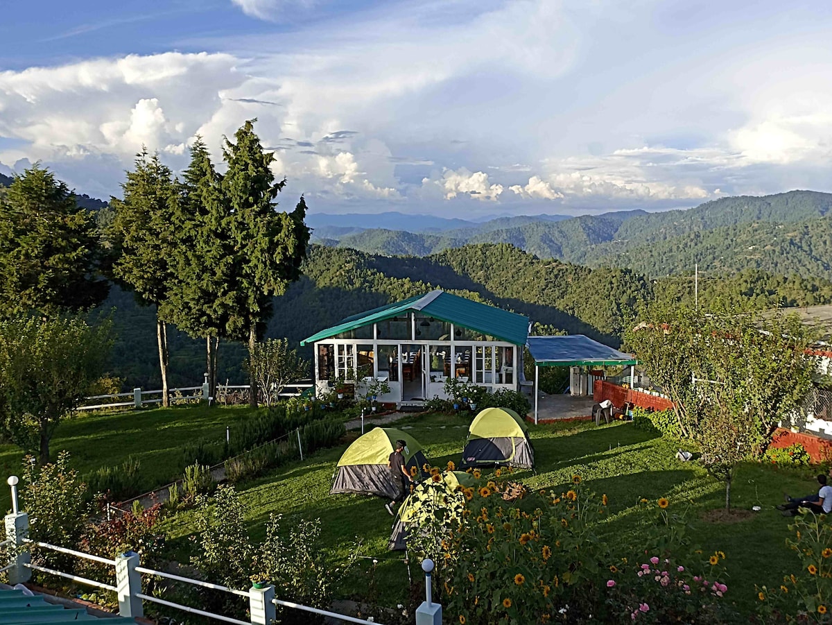 Beautiful “Tree House” is made of pine wood. It is built on Oak Tree with kitchen and a deck which offers beautiful view of valley. A glass window on its roof and stars are visible during autumn when tree sheds its leaves. Woodpecker loves oak tree as small holes on its bark and branches are used to store winter food. A lawn and big courtyard next to tree house is for playing badminton, have evening tea, relax and bird watching. The location is safe for everyone.