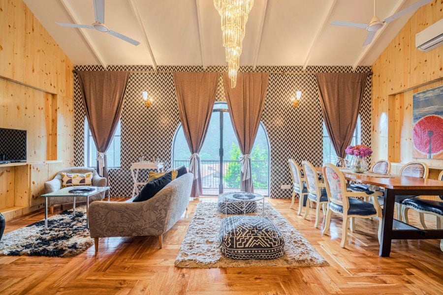 Tucked amidst a canopy of trees & just an hour from Kainchi Dham, this hillside retreat is perfect for large gatherings! A standout feature is the indoor pool—enclosed by glass walls & complete with a mirrored ceiling, poolside seating, changing rooms & a steam room. Inside, the living room offers wraparound windows, a chandelier, a glass-top table with carved elephant bases, and a TV for entertainment. The outdoor sitting area with a fire pit sets the scene for cosy evenings under the stars.