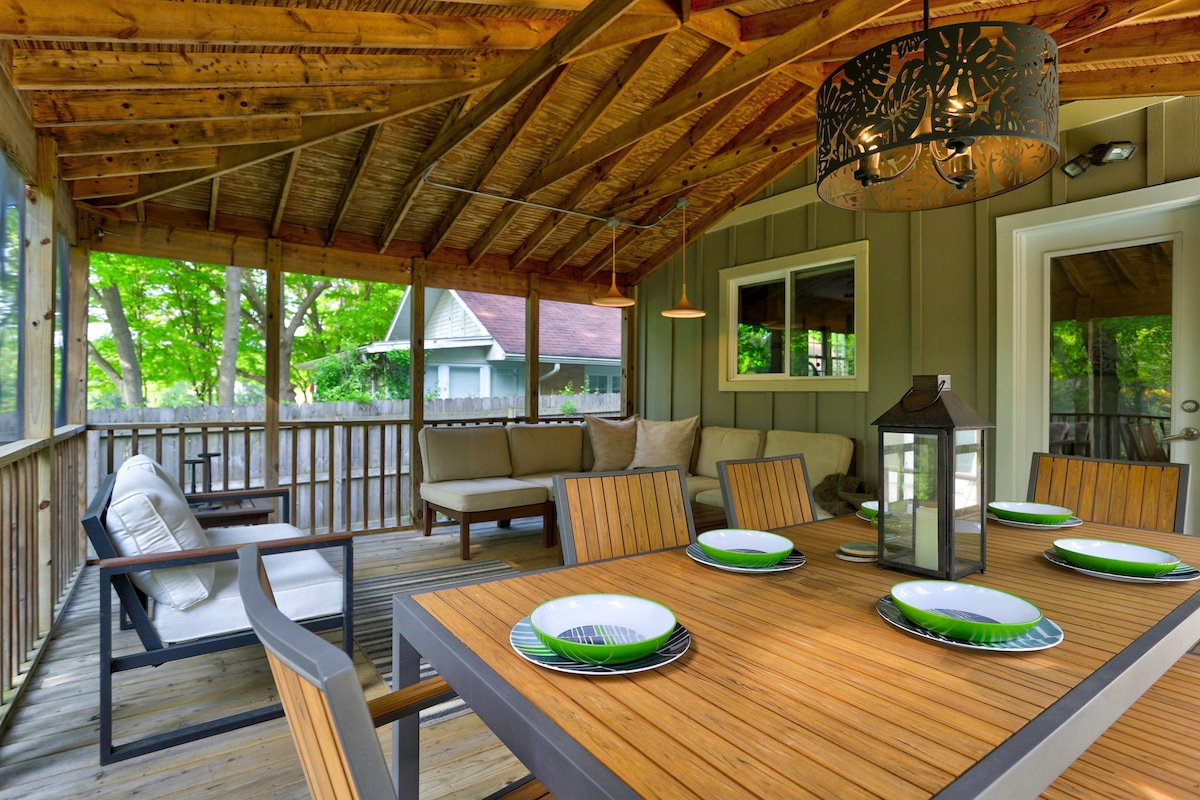 Sumptuous 4 BR/2.5 BA vacation home, just 1 block from Lake Michigan. Fully refurbished with reclaimed flooring, antique beams, custom doors, and fixtures. High-end kitchen, dining, and living areas with French windows. Living room features a stone fireplace, stylish couches, and a wide-screen TV. Three ground-floor bedrooms and baths with a second-floor bunk bed loft. Detached garage is a posh game room with high-end tables and a big TV. Covered patio, 4-seat dining, and bluestone courtyard. This property has been selected for inclusion in The 100 Collection, a global designation awarded to only the top professionally managed vacation rentals based on consistent quality and service. Classy, awe-inspiring, and sumptuous, this 1928 4 BR/2.5 BA vacation home, located just a block from Lake Michigan in “Harbor Country,” was once a local retail gathering place. Recently refurbished into a stunning residential home, it includes gorgeous reclaimed flooring from antique beams, custom doors, light fixtures, and hardware, as well as top-of-the-line plumbing fixtures. The kitchen-dining room-living room area—a massive, superbly well-lit space—features entire walls of French windows, original glass-block, and a wide array of seating options for meals: 4 chic stools at the white marble island, 4 leather seats around a circular marble coffee table, and a 10-seat reclaimed wood dining table. The beautifully lit living room has a classic stone fireplace at its center, stylish (yet ultra-comfortable) couches and chairs, and a wide-screen TV. In addition to the three bedrooms and bathrooms on the ground floor, there’s a second-floor sleeping loft, perfect for kids with cute bunk beds and a real (mini) teepee. All bedrooms feature top-quality bedding and linens, ensuring a sound sleep and sweet dreams for you and your guests. Black Door Bungalow can sleep up to 10. MAIN FLOOR Primary Bedroom: 1 King bed Bedroom 2: 1 Queen bed Bedroom 3: 1 Queen bed UPSTAIRS FLOOR Bedroom 4: Full-over-full bunk bed that sleeps 4 Another “extra” is the detached garage, which has been turned into a posh game room, with high-end shuffleboard and foosball tables, a big-screen TV, and a sound system. The exterior—featuring a spacious covered patio with cozy rattan couch, chairs, and a 4-seat dining table, leading to a bluestone courtyard—has been extensively landscaped with lush plantings, trees, and professional lighting. The home also includes a high-end kitchen, EV charger, and laundry appliances. In addition to being an easy walk from a majestic, crystal-sand Lake Michigan beach—and a super-short drive to popular beaches like Pier Street Beach and Cherry Beach—you and your guests can also enjoy the many activities afforded by being near Warren Woods State Park, which offers all sorts of woodland hiking and biking trails. The region’s largest recreational harbor provides countless water-related excursions and rentals, from fishing trips to boat, kayak, jet-ski, and paddleboard rentals, as well as day and evening cruises. There’s also the Acorn Theater, a local treasure for live performances by nationally recognized music artists, and a number of nearby breweries, wineries, brew pubs, and even an award-winning distillery for you to check out. Of course, you and your guests can also enjoy sampling to your heart's content the many popular restaurants, cafes, art galleries, boutiques, and antique shops just a hop, skip, and a jump away in Union Pier and downtown New Buffalo.