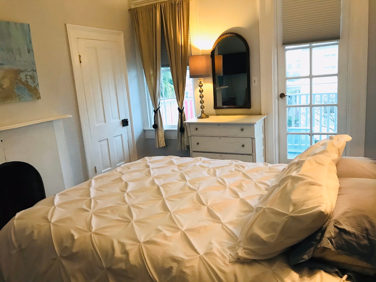 二楼转角加大双人床卧室,可俯瞰萨凡纳历史区的西利伯蒂街