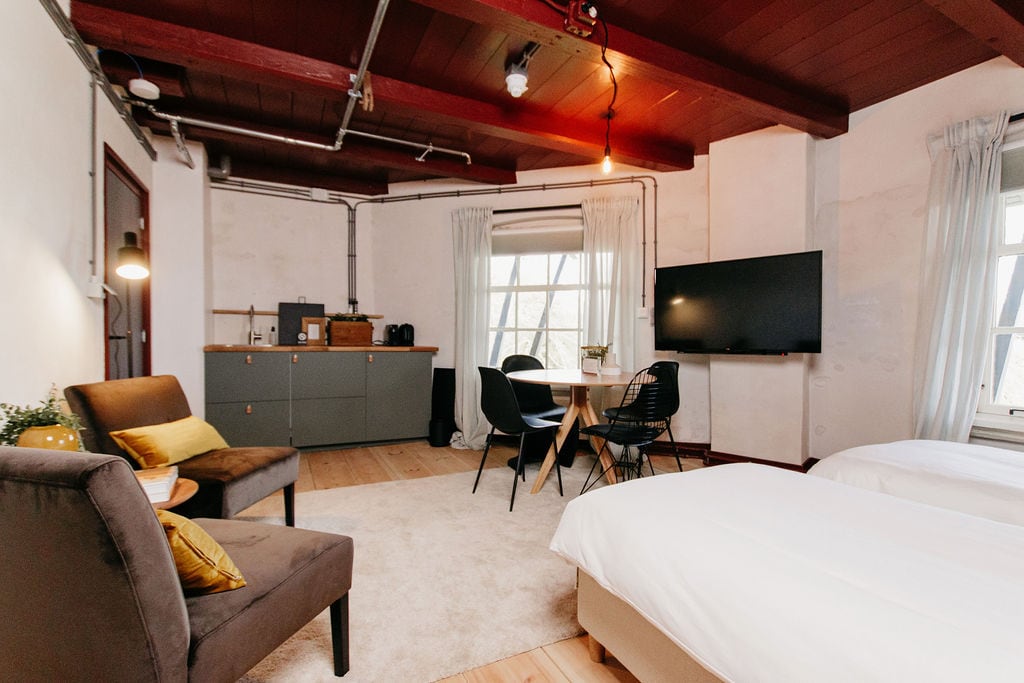 Deze mooie suite is beneden in de molen met mooie hoge plafonds en ramen kunnen jullie optimaal genieten van de omgeving. Je komt binnen in de living van de suite daarnaast heeft de suite een aparte slaapkamer met grote semi-open badkamer met ligbad en badproducten van Maris Stella Marie. De suite is verder voorzien van een Stapel bedstede, dus leent zich naast een romantische overnachting ook voor een relaxte gezinsvakantie. Tevens is er een keukenblokje met Nespresso machine.