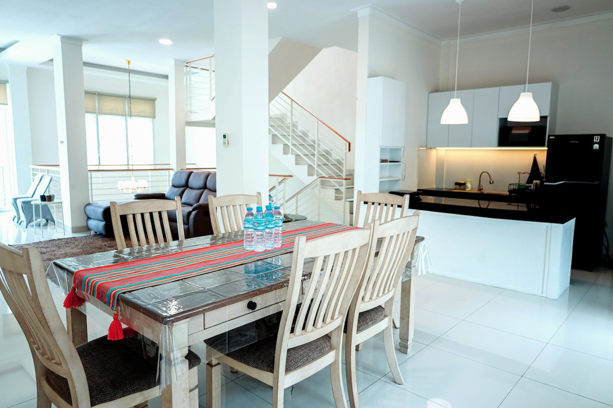 Tucked at the end of a road with a quiet neighborhood, this six-bedroom home is perfect for a family getaway. It has a swimming pool and fast wifi that is suitable for you and a small group to work or study during these WFH periods. With a 700 M² house built on 1500 M² land, it features 9 AC units, a Dining Room, a fully equipped Kitchen with a refrigerator, cold/hot water dispenser, stove, rice cooker, toaster, and a cooking and dining set. Washing and ironing facilities are also available.