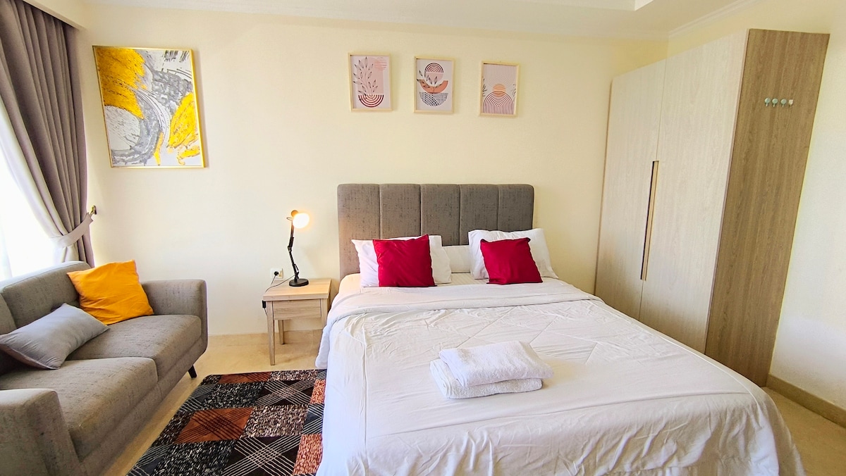 The "Hagu" Luxury cozy living provides you with Breathtaking interior design, views & location. You will stay in 58 sqm one bedroom apartment with luxury amenities & facilities. Our Hagu living room gives you 65" Smart UHDTV, big L shape sofa, classy paintings which perfectly deliver you a panorama of CBD BSD city view. The "Hagu" bedroom pampers you with a king-size bed and working space with a city view. It is ideally suited for business executives with long-term stays & leisure seekers.