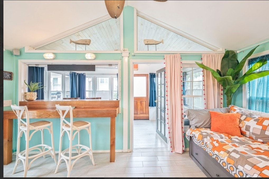 90 STEPS TO THE BEACH Adorable/affordable beach bungalow sleeps 4 with a kitchenette w full stove /oven two mini fridges full bathroom breakfast nook seats 5. 1 queen bed in main room & 1 king daybed in the middle room. The tiki bar is now enclosed w sofa and two chairs & total 4 barstools. Outside use of firepit and entertainment stage. COVID CLEANING PROTOCAL Groups 25 years old and below are not allowed.