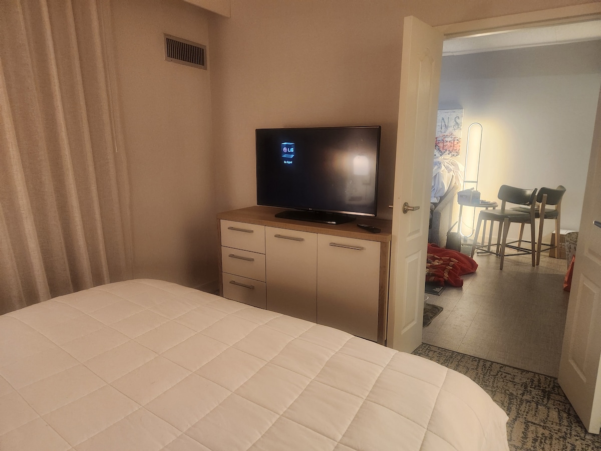 Fully renovated condo with new high-end furnishings. 1 Block from the beach! This shore condo is perfectly located across the street from Icona & Windrift, SH outdoor rec center and minutes from shopping & dining. Suite offers sleeping for up to 6 people; queen & twin in bedroom and a queen pull-out in living room (linens provided) fully stocked kitchen and 1 full bathroom (linens provided). Hotel amenities include: indoor/outdoor pools, exterior lounge/sitting areas, WIFI, parking.