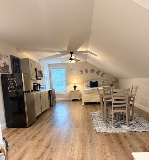 The Loft at Haven is a private 2nd story studio apartment with a full bath and kitchenette, nestled on a peaceful, family-owned 40-acre lakeside property just minutes from Stone Harbor and Cape May. Enjoy expansive lake and forest views from your private deck, large windows that flood the space with natural light, and direct access to hiking trails, hammocks, county bike path, and a crystal clear lake with complimentary water sports equipment.
