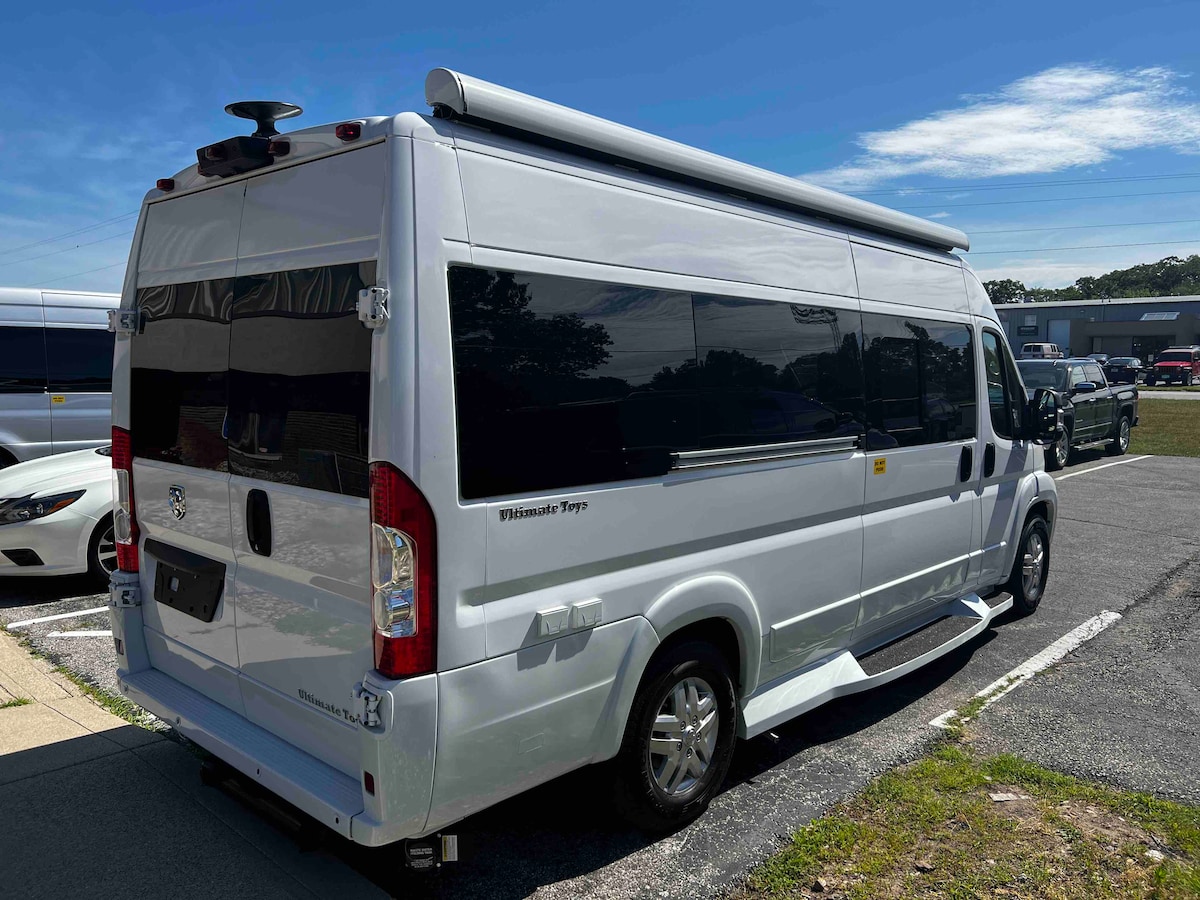 Set out for an adventure with this brand new luxury camper van, equipped with kitchenette and full bath. This custom van started as a 3500 ProMaster with 159” wheelbase, and then we piled in all the bells and whistles. Exceptionally well-crafted and outfitted for a night’s campout or an extended journey on the road less traveled. Custom woodwork and beautifully handcrafted interior. Automatic transmission, gasoline, no need for special license. 8 seatbelt seats. Sleeps 2.