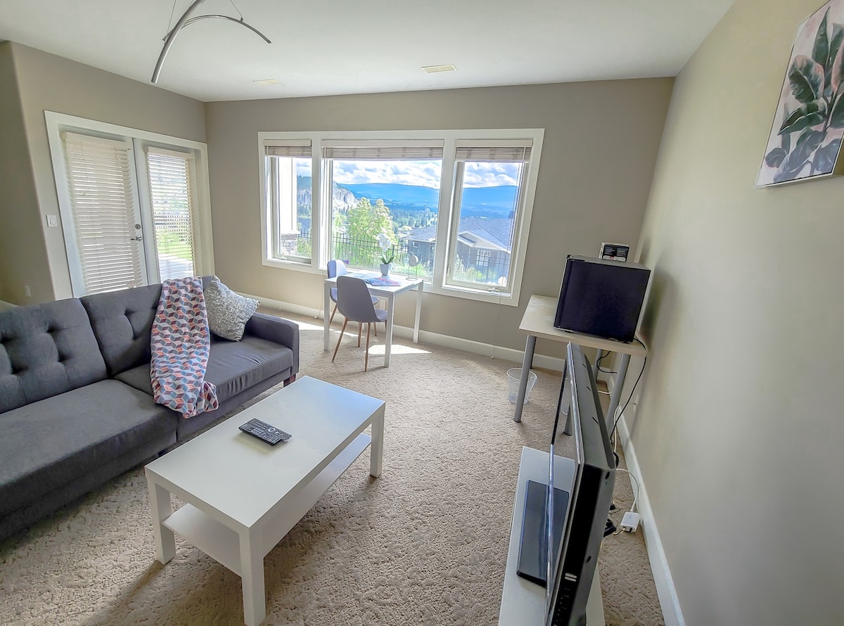Come relax and enjoy the views from this self contained one bedroom suite with private keypad entrance. Very large outdoor space with lots of seating. Full kitchen including stove/oven, full sized fridge and dishwasher. Coffee Maker, Kettle, toaster etc. King bed in the bedroom with WIC/ laundry for your convenience. Beautiful views of Kelowna day and night. Next to park, hiking, beaches, and 5 min to shopping and restaurants downtown. There are many Wineries just a 10 minute drive away.