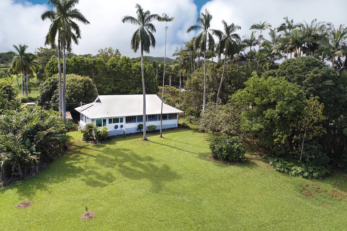 This modern farm house offers beautiful views of our bustling organic farm and the Kona coastline beyond. Nestled in a secluded banana grove, this private custom 2 bedroom/2 bath home boasts comfortable Cal King beds, fresh linens, vibrant plants, vintage island furnishings, a well-appointed kitchen, and welcoming outdoor living spaces. You can sample our organic farm produce in a welcome basket, as well as at nearby stores and restaurants a short walk away in Kealakekua village.
