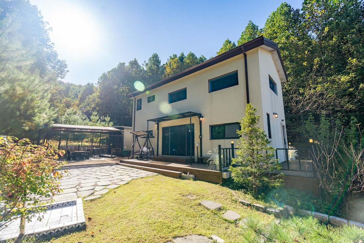 서울 근교의 평온한 전원주택 마을에 위치해 있는 300평대 독채입니다. 남향을 향해있어 아침햇살이 아주 따사롭게 비춰줍니다. 봄 벚꽃, 여름 계곡, 가을단풍, 겨울 설경, 사계절 최적의 숙소입니다 청결하고 미니멀한 숙소를 제공하고자 당분간은 게스트 최대 인원수를 3인으로 제한하고자 합니다. 2세 이하 영유아와 함께 방문시 최대 4인입니다. 게스트분은 독립적으로 2층집 주택의 1층전부와 정원을 전용으로 이용하 실 수 있습니다. 주인댁은 2층에 거주하시며 들어가는 입구가 분리되어 있어 프라이빗한 시간을 보내실 수 있습니다. 조용한 주택들이 모여있는 동네여서 평온한 휴식 시간을 즐기실 분들에게 잘 어울릴 만한 숙소입니다. [바베큐] 스탠딩 바베큐그릴 + 석쇠 준비 가능하며 추가비용은 1만5천원 입니다. [벽난로] * 벽난로는 기온이 영하로 내려가는 계절부터 피우기 시작합니다. * 벽난로는 화제위험과 실내로 연기가 퍼질수 있어 주인장이 직접피워드립니다~