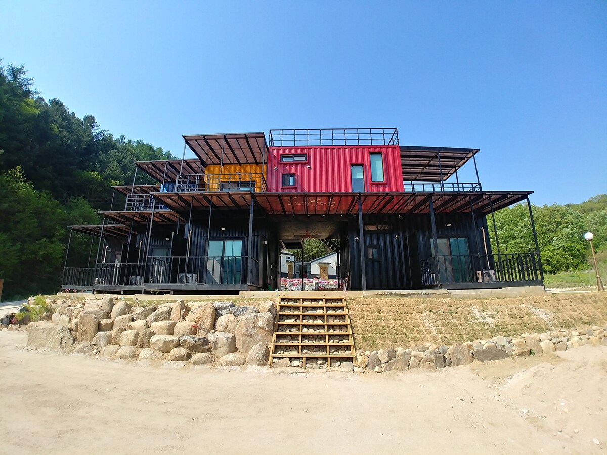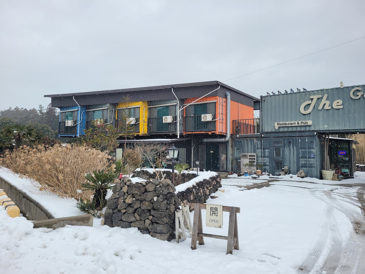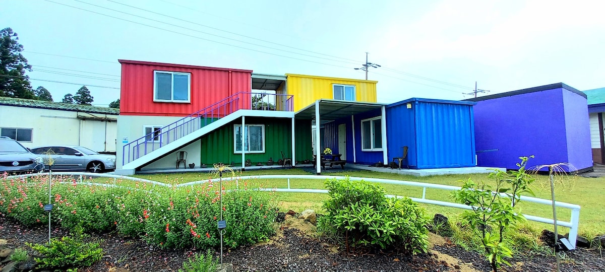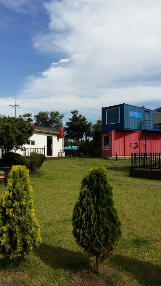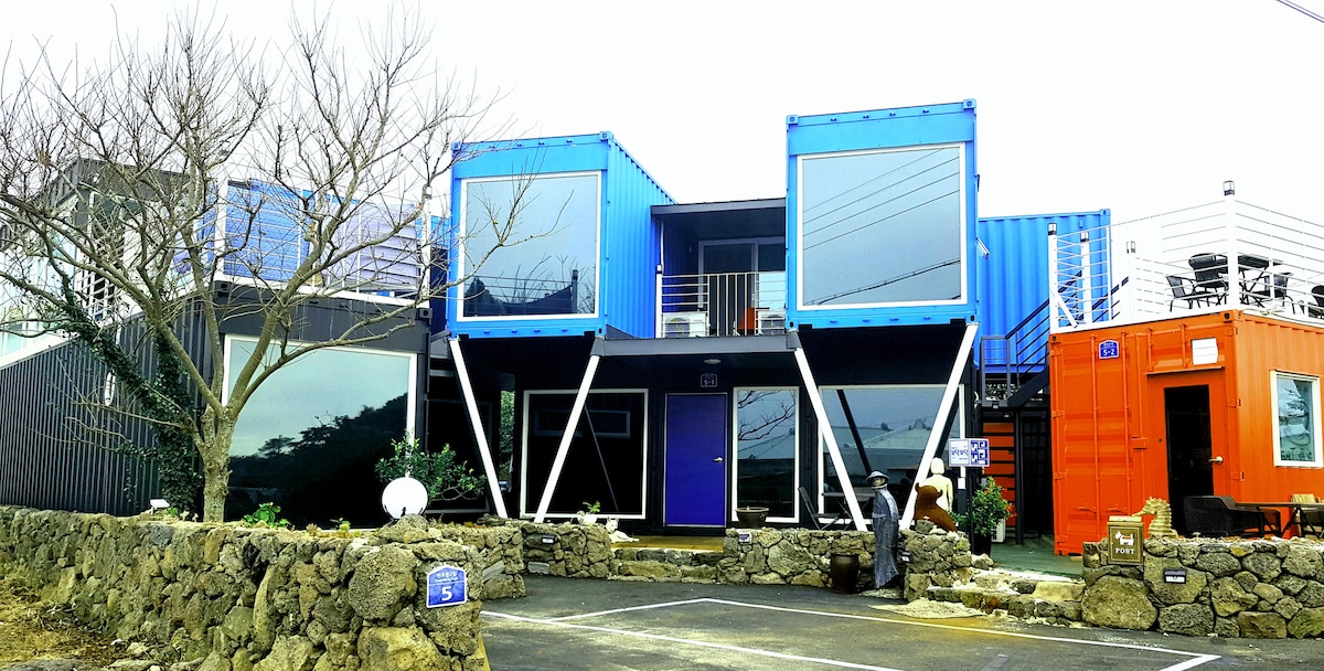 蓝色房间集装箱房,类似于济州的绿色植物