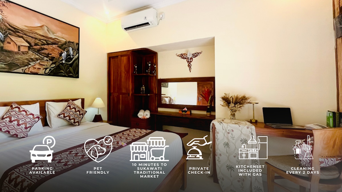 Watuluna Sweet is close to restaurants dining, Balinese dance performance stage ,supermarket, family-friendly activities and 20 minute away to Sanur white sand Beach. The location supported by the people, the ambiance,and the culture. Watuluna is good for couples, solo adventurers, and business travel. Watuluna Guesthouse also organise sight seeing tour, car n driver to hire , scooter , speed boat ticket to Gili Trawangan,Lombok n lembongan Island ,diving , and white water rafting.