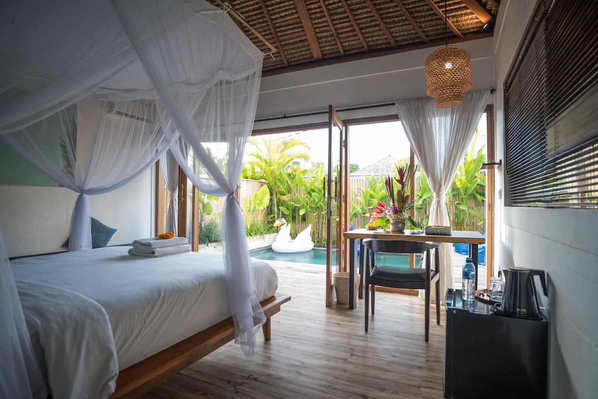 🌴 Designed Bungalow | Chaos & Chill for 3 Besties 🌴 ⍨ 45m² for max-level vibes ⍨ 1000m² garden (shared with cats supervising 🐱, frogs singing 🐸 & geckos judging 🦎) ⍨ 12×4m pool — cannonballs encouraged 💦 ➤ Themed AC bedroom & bathroom = jungle luxury ➤ Roofed kitchenette & coffee corner ☕ ➤ Terrace w/ 180° drama & awkward selfies 🍹 ➤ Breakfast 7:30–10 (pajamas welcome) ✦ Fast Wi-Fi for memes & gossip ✦ Scooters mandatory — adventure unavoidable ✦ Laughs guaranteed, bugs optional