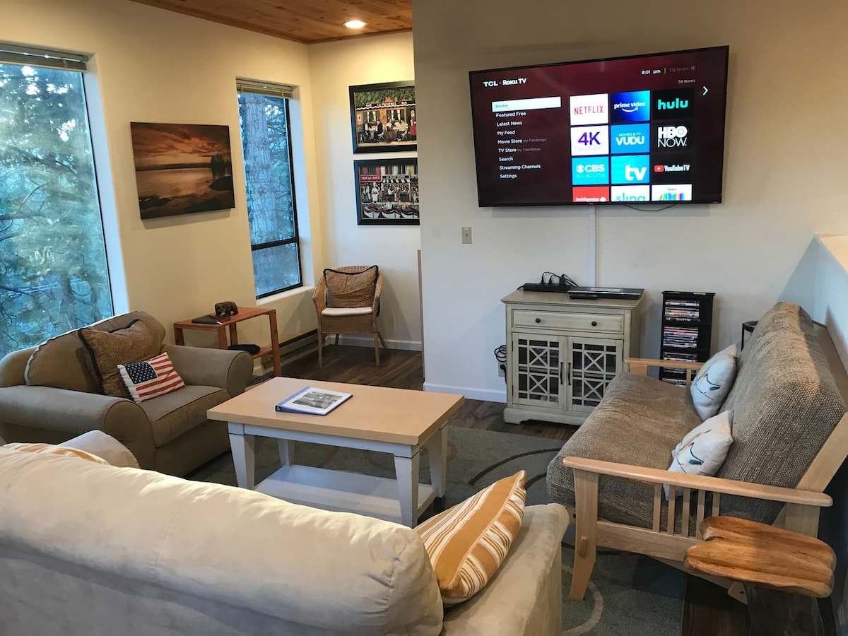 Cleanest and Newest Home in Tahoe! Relax in this architecturally interesting, immaculate, and spacious home. The spa-like master bedroom includes a large soaking tub, a tile shower with two powerful shower heads, and a KING bed. The cozy, light-filled guestroom with QUEEN bed and custom bathroom is the perfect retreat. Fully stocked, the modern kitchen will inspire gourmet meals. With its vaulted ceiling, QUEEN bed, and smart entertainment, the living room is perfect for apres and movie night.